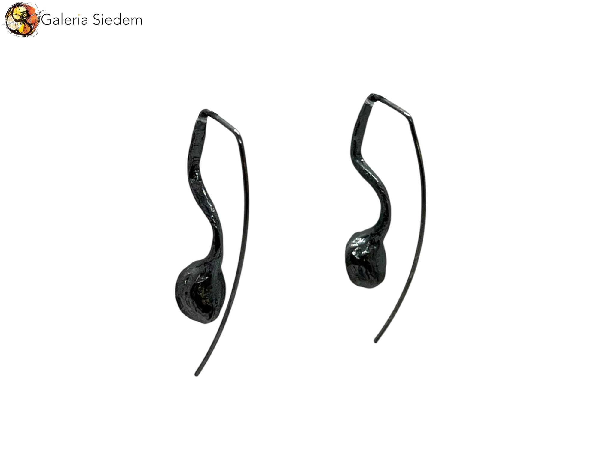 Podłużne, wyważone w proporcjach, o subtelnie nieregularnej fakturze oksydowanego srebra, które przypomina ręcznie modelowaną powierzchnię metalu.