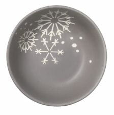 Mała miseczka na ciasteczka, wykonana z szarego szkła kamionkowego. Ozdobiona pięknymi płatkami śniegu.