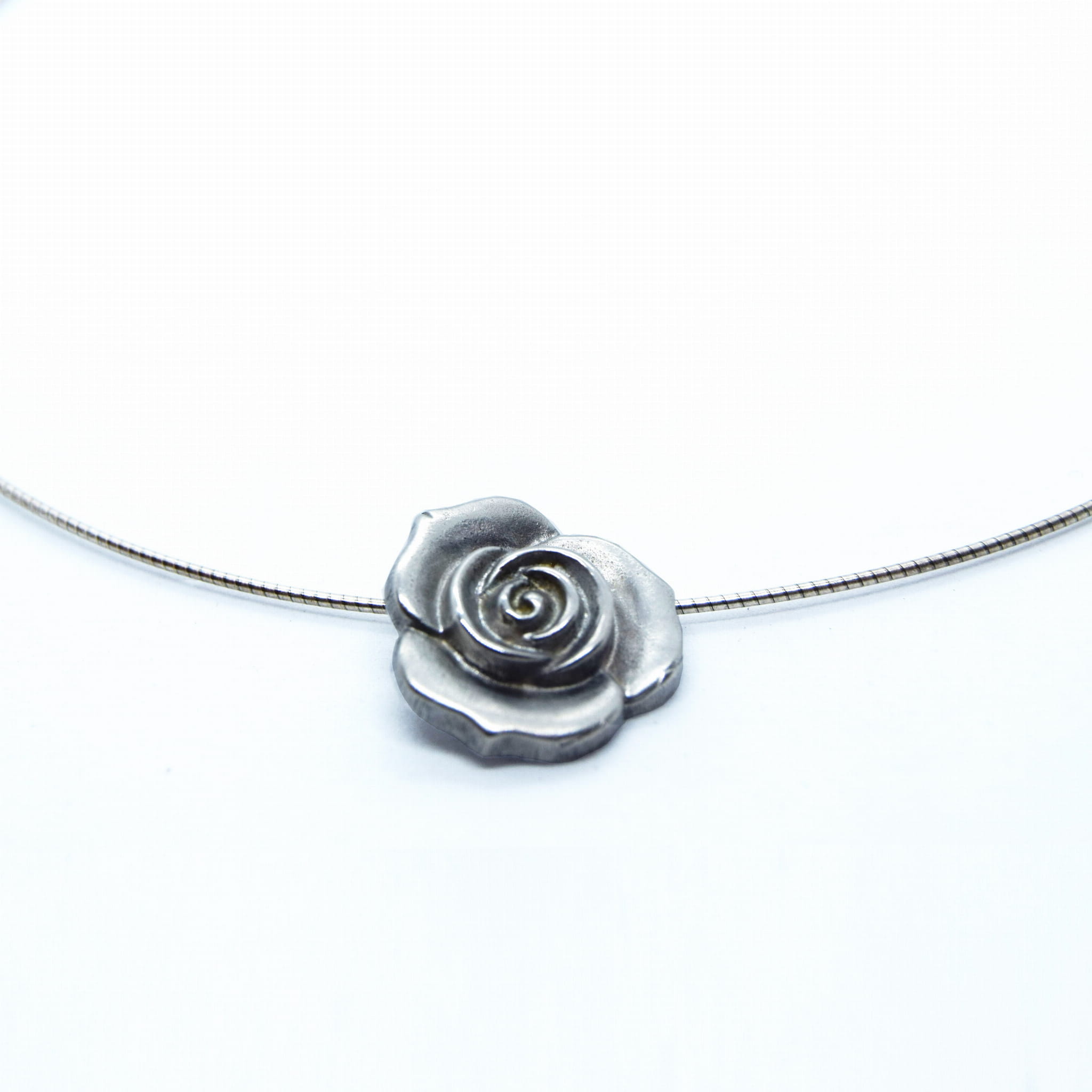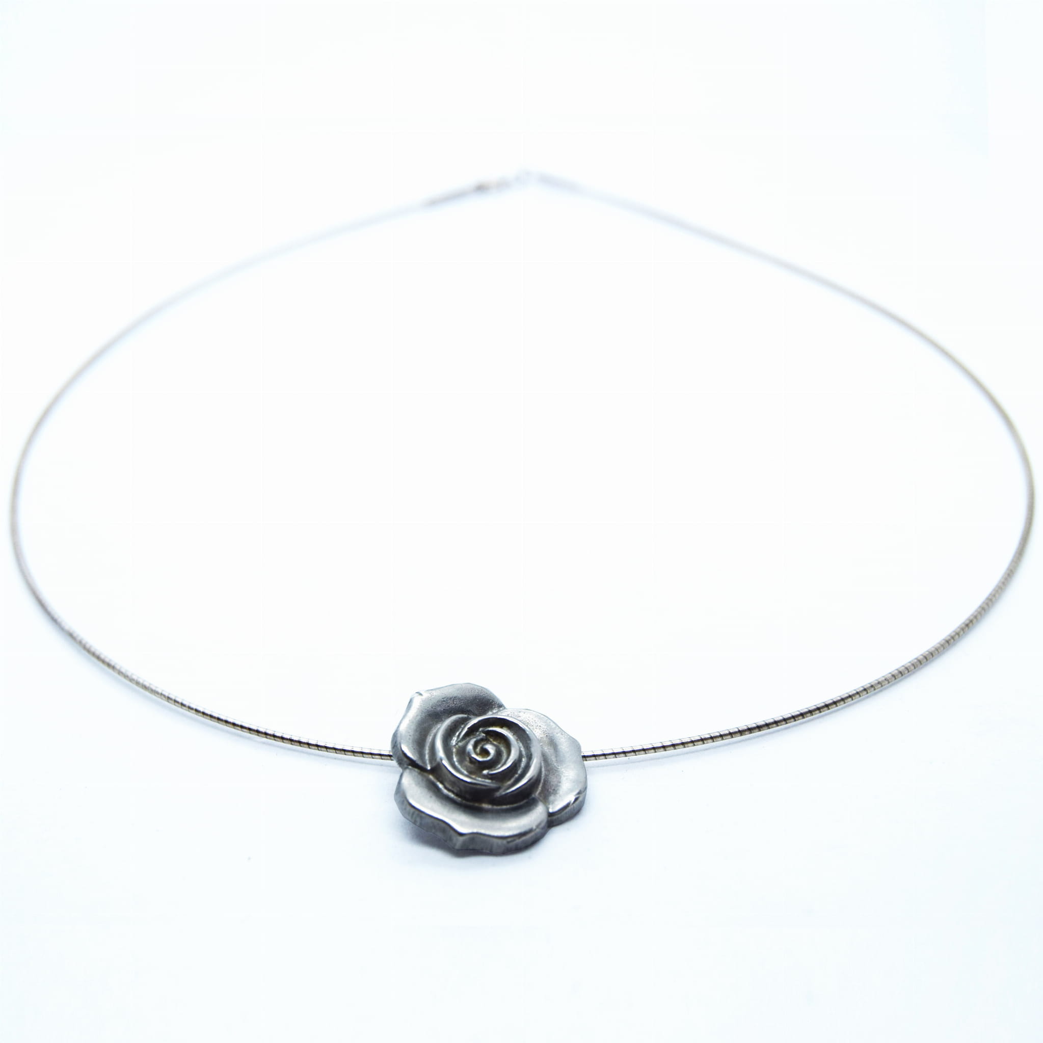 Naszyjnik na lince stalowej zakończony drobną srebrną zawieszką w kształcie róży.