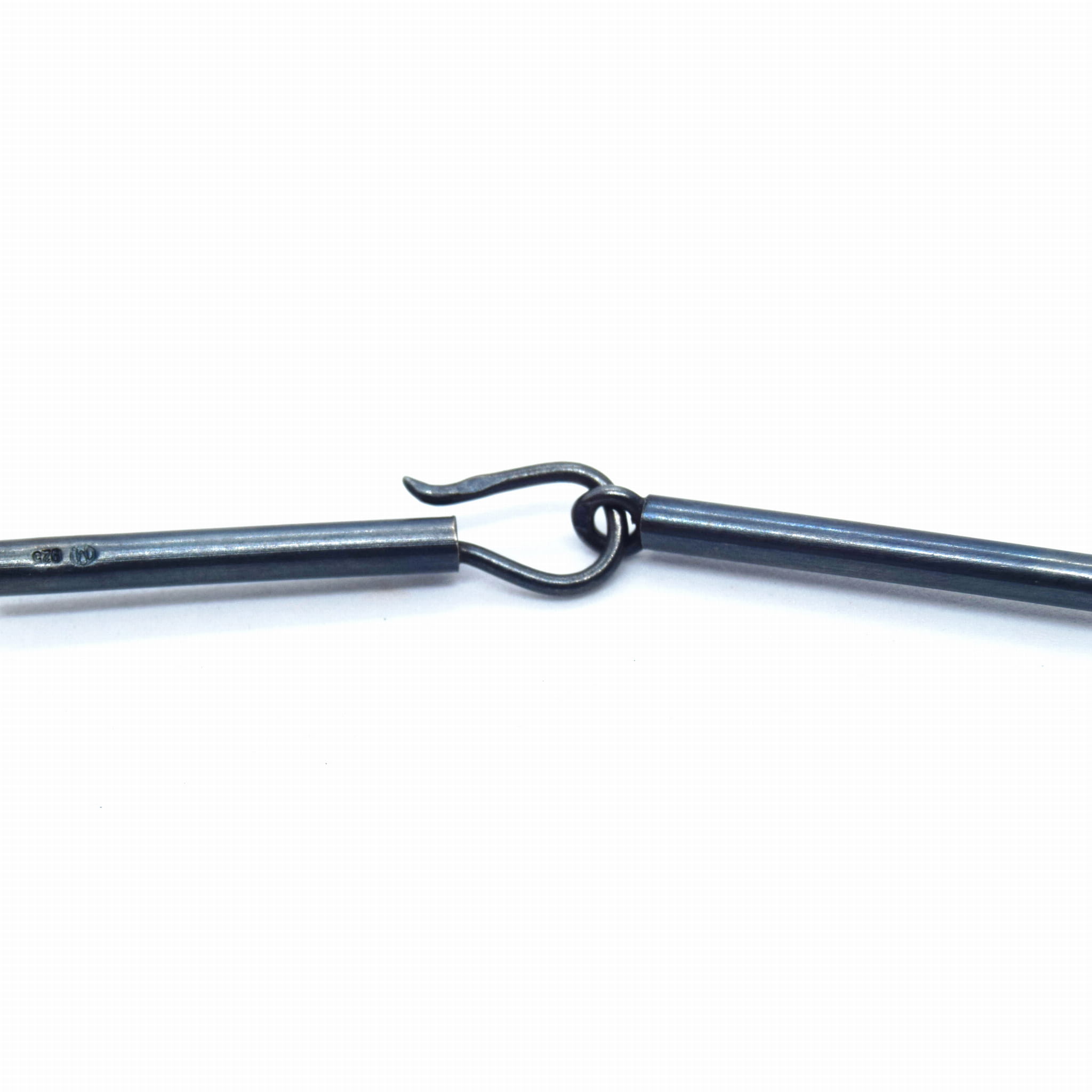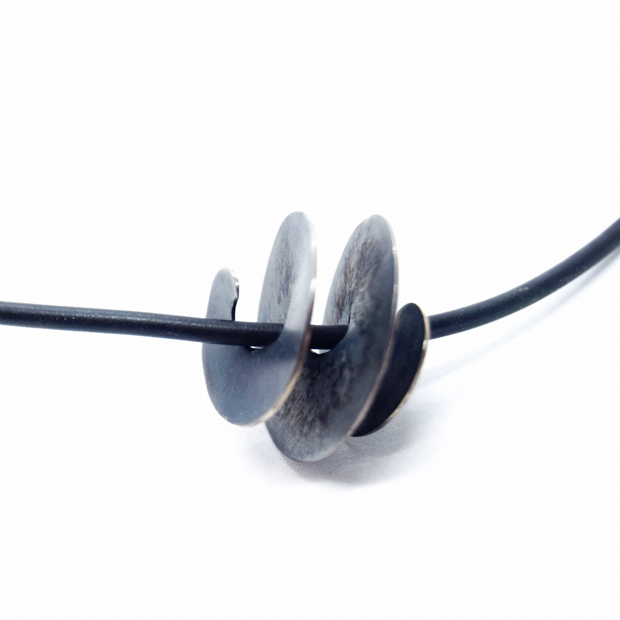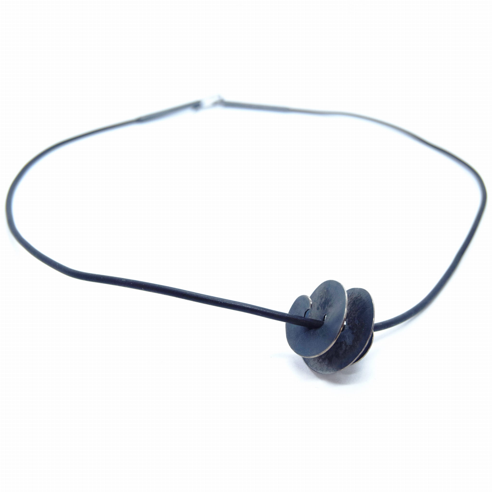 Naszyjnik w formie rzemienia zakończony srebrną oksydowaną spiralą.