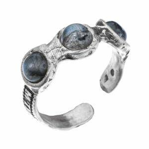 Srebrny pierścionek wykonany został ręcznie z największą dbałością o każdy szczegół w naszej pracowni biżuterii Motyle. Wygodna, regulowana obrączka tworzy jedność z wkomponowanymi naturalnymi kamieniami. Trzy okrągłe, kolorowe kamienie oprawione w organiczną oprawę tworzą kobiecą, energetyczną kompozycję. Artystyczny pierścionek idealnie komponuje się z subtelnymi kolczykami na sztyft z tej samej kolekcji.